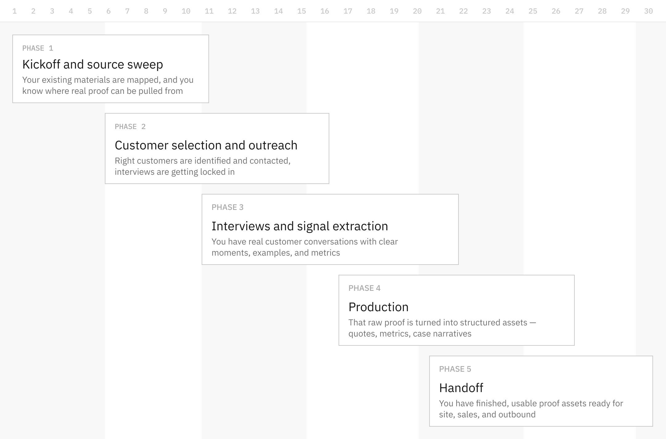 This is a focused, one-month engagement. I run the interviews and produce the proof myself. From $10,000.